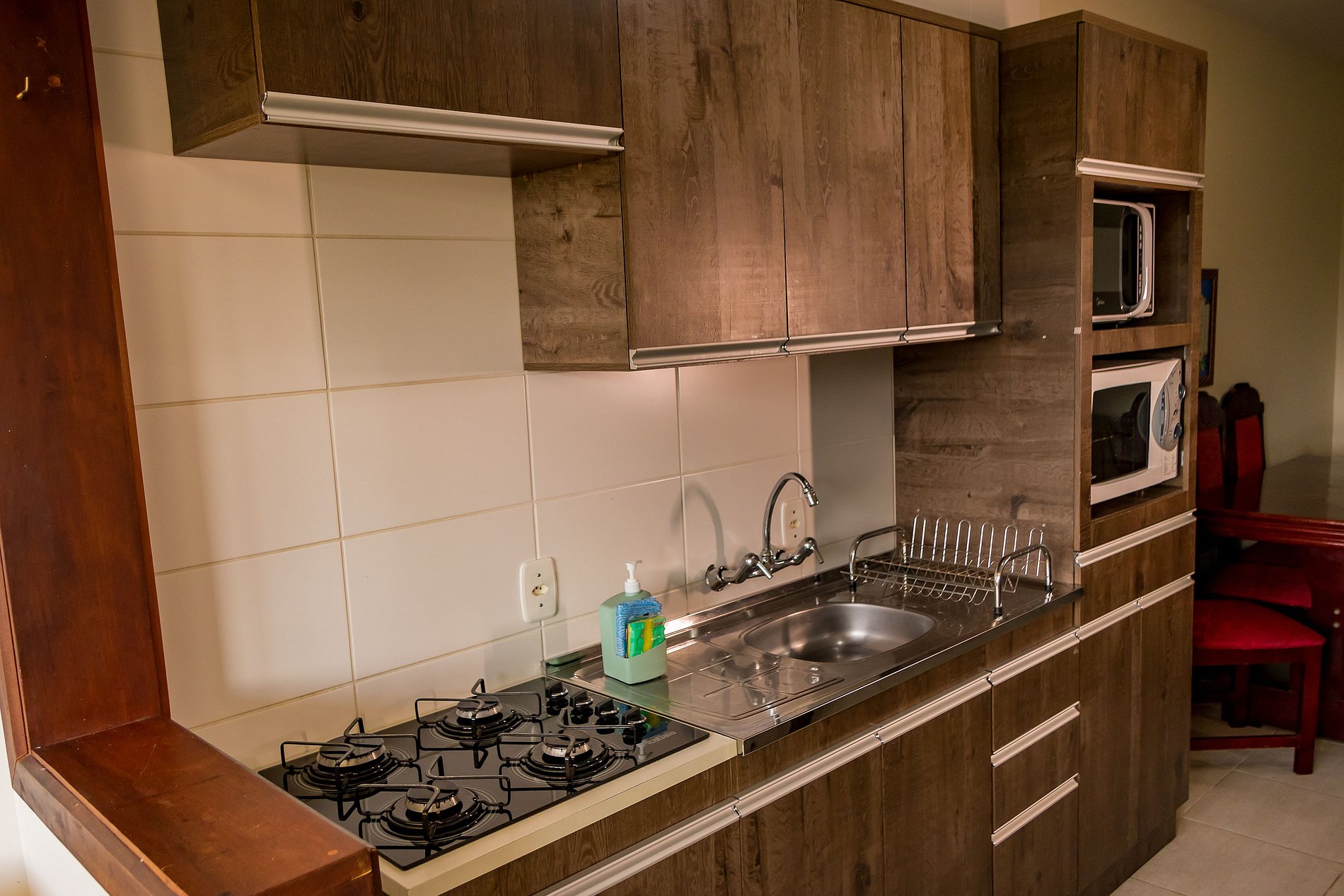 - Cozinha com micro-ondas, fogão, forno, diversos itens de cozinha, e mesa para 6 pessoas